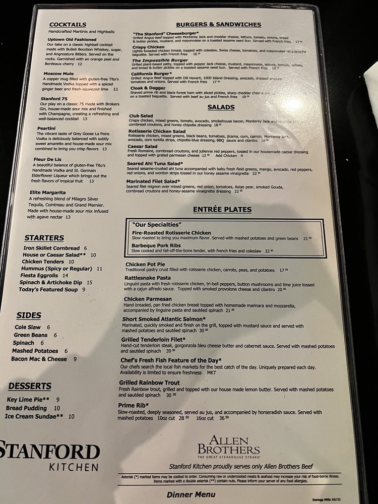 The menu is a treasure trove of flavors. Start with the Iron Skillet Cornbread or Fiesta Egg Rolls before indulging in the famous Crab Cakes that have diners raving. Don't forget the refreshing drinks—try the Moscow Mule or the house special Stanford 75.